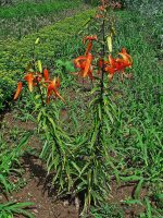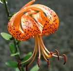 This vigorous, easy to grow, perennial lily from Asia captures the eye with its large tumpet-shaped flowers produced in profusion in mid summer. The 5″ wide flowers are orange with maroon to black spots, and are nodding with reflexed petals. Up to 40 blooms may appear on a single stem! Growing 3-5 ‘ tall, the plants are disease resistant and thrive in sun to partial shade and consistently moist, well-drained soil. The plants are attractive in beds, borders, and containers, and the flowers are beautiful in the vase. Photo Credit Wikipedia