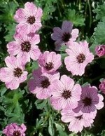 Saucer-shaped pink flowers 1” across and lined with purple veining are borne in late spring to early summer on low spreading plants. The cultivar ‘Ballerina’ is only 4-6” high and has 2” flowers that are lilac pink with a dark center and purple veining. The flowers are sterile and so the plant is long blooming.