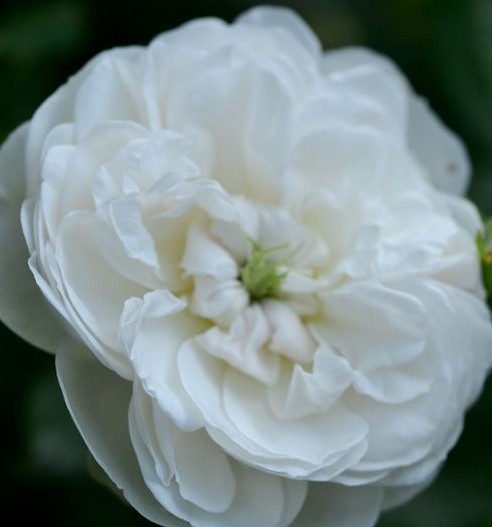 Rose ‘Madame Hardy’ has buds with a hint of pink open to pure white cup-shaped blossoms that ultimately open flat. The outer petals are slightly reflexed and surround an interior of short, ruffled petals quartered around a green eye. The flowers are usually produced in clusters of three to five on prickly stems. Plants have an abundance of pale green leaves, are vigorous, and are considered very disease resistant.