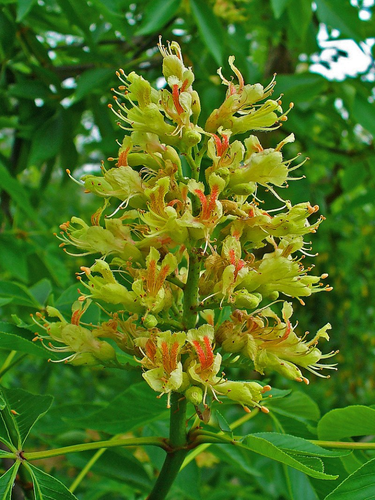 This large deciduous tree has an irregular upright-oval canopy, branches that usually sweep the ground, and bark that is sometimes exfoliating. The palmately compound leaves are 9-15″ long and usually have five oval, pointed leaflets that are 4-6″ long. The leaves turn yellow to orange or red in the fall. Panicles up to 7″ long carry cream to yellow to yellow-green flowers in spring. The flower are about 1″ long, and have 4 petals and stamens that are shorter than the petals. The fruit that follows is a round to oval, leathery, tan capsule 2-3″ in diameter and containing 1-2 seeds. The flowers attract hummingbirds, bees, butterflies, and other pollinators and the seeds are eaten by squirrels.