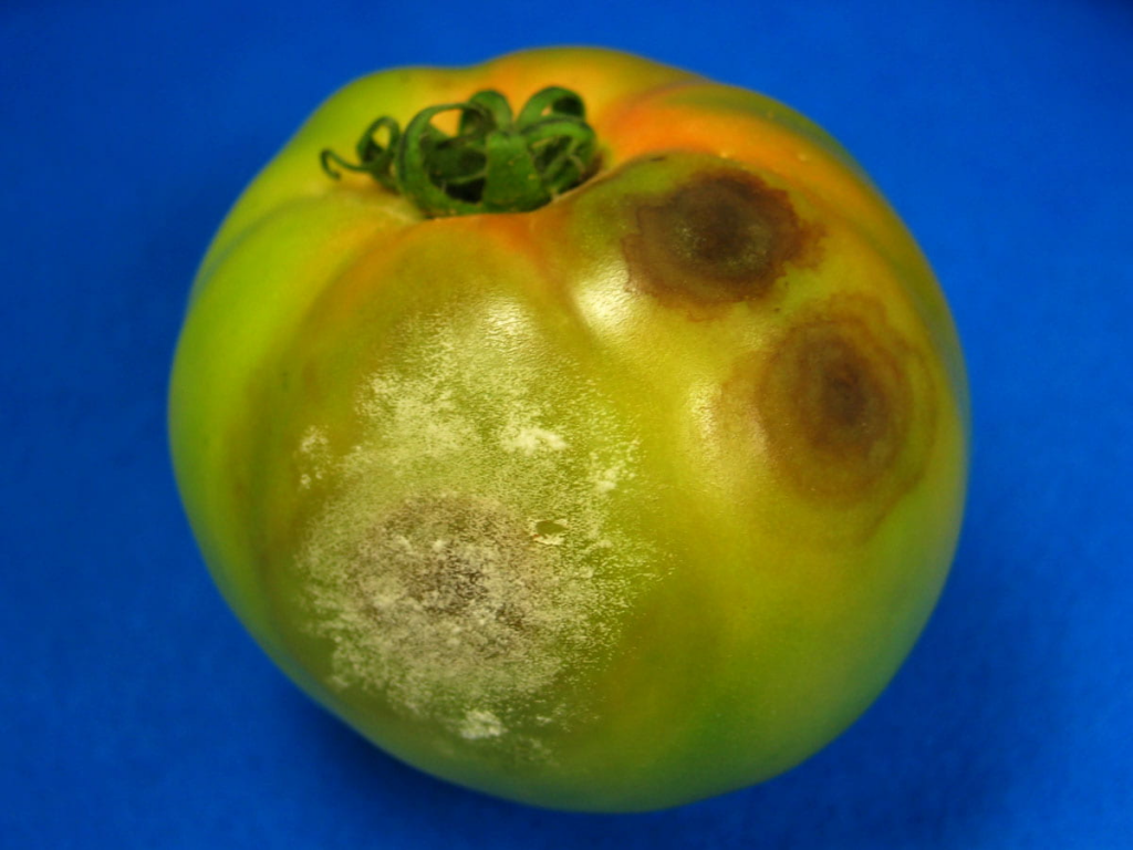 Buckeye Rot of tomato is caused by three species of the soil borne fungus-like water mold, Phytophthora: P. capsici, P. drechsleri, and P. nicotiana var. parasitica. The disease is common in areas with high rain fall and humidity such as in the southeastern and south central US. It usually appears when the temperatures are between 75 and 85 F and the soil is wet, causing damage to both the stems and fruit of eggplants, peppers, potato, pineapple and tobacco as well as tomatoes. Green or ripe fruits that touch the ground are particularly susceptible and develop brown, wet-looking spots that increases in size and develop alternating light and dark brown concentric rings as it grows larger. The spot start out smooth and firm but may become soft and produce a cottony white mass. Splashing water as well as surface water can spread the disease from plant to plant. Photo Credit CALS