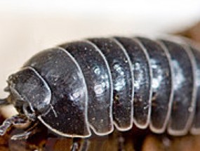 Woodlice can be a pest in the garden when the eat young seedlings. Altough sowbugs and pillbugs look very much alike, those that roll up into a ball when distubed are known as pillbugs or roly-polies. Both sowbugs and pillpugs are flat, gray in color and have segmented bodies with seven pairs of legs and two pairs of antenna (only one of which can be seen). In addition, sowbugs have two appendages at the end of their abdomen that pillbugs lack. Both animals like moist conditions and are often found in mulch or compost and under rocks, logs, boards, flower pots, and garbage cans.