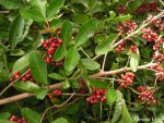 Description: Plants grow up to 30’ from a shallow root system and have upright or sprawling branches and pinnately compound leaves with 5-15 ellipitical, finely toothed leaflets 1-2” long. Small white male and female flowers are produced in 2-3” long axillary clusters on different plants from summer to fall. Female plants produce clusters of small one-seeded fleshy berry-like fruits that are glossy and green at first but ripen to bright red. The berries are very attractive and used in flower arrangements especially at Christmas.