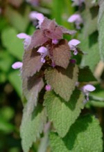 Square unbranched stems grow eight to twenty inches tall and carry opposite leaves that are triangular and pointed. The leaves are covered with fine hairs, have wavy to serrated margins, and shade from green at the base to purplish green at the tip. They are .8 to 2 inches long, have a crinkled surface, and are carried on .4 to .8 inches long leaf stalks (petioles) that distinguish them from another common weed, henbit dead-nettle (Lamium amplexicaule), that has stalkless leaves. Red purple flowers are ½ inch long and appear with leaves in terminal clusters in spring for about 1 ½ months. Each flower has upper and lower lips of fused petals. The top lip is hood-like while the lower lip is divided into two lobes. The flowers are an important source of nectar and pollen for bees. Plants readily self seed and can form dense colonies. The root system is fibrous.
