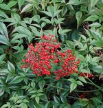 Description: Heavenly bamboo grows 3-8’ tall and has bi- to tri- pinnately compound leaves that are 12-24” long and turn reddish green in winter where the climate is mild. The white summer flowers appear in loose terminal panicles 8-15 ” long and are followed by bright red berries that persist into winter and are attractive to birds. Cultivars are available that vary most significantly in size and fall coloration, and attempts are being made to produce ones that are sterile.