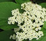 Description: The bold dark green leaves are 2-5” long, elliptical to ovate, leathery, thick, and toothed, and have large white conspicuous veins on the underside. Flat-topped clusters of creamy white flowers 3-5” in diameter appear in spring and have a fishy odor. Fruits are green turning to red, red-orange or red-yellow by early late summer but often fail to appear. The plants are vigorous, tend to get leggy, and can become invasive. Several cultivars are available that vary in size and foliage color.