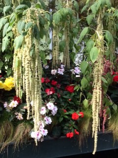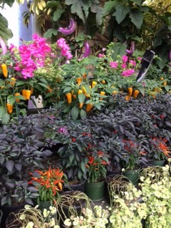 Two different kinds of peppers formed this display with purple leafed, and variagated trailers and pink geraniums in the background.
