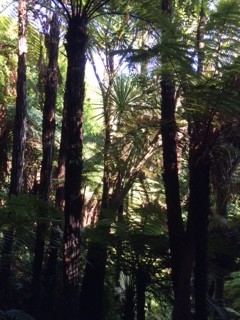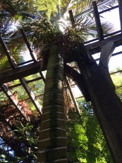 A Nikau tree, the most southerly growing palm, reaches up to the sky. Its leaves were used by the Maori for huts and baskets.