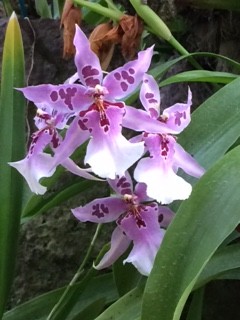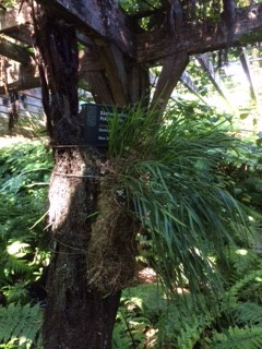 A bamboo orchid, indigenous to New Zealand grows as an epiphyte on a bark mounting.