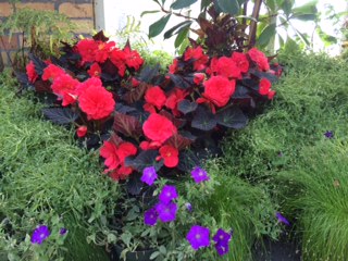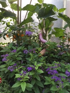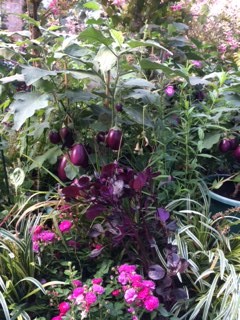 The eggplants were paired with blooming annuals and perennials to make great combinations like these purple ones with pink petunias and purple leafed foliage plants.