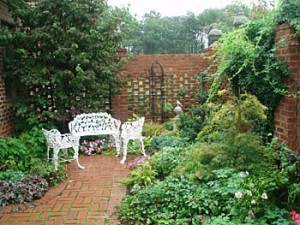 The small walled garden attached to the house welcomed guests with a small seating area.