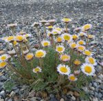 lso known as cutleaf daisy and trifid mountain fleabane, this alpine alpine species is found in western US from the Pacific Coast to the Dakotas, Colorado, and New Mexico where it grows on cliffs rocky slopes and talus, as well as in woodland edges, meadows and plains. Plants have a stout taproot and spread by rhizomes to form small clumps. They grow up to 10″ tall and have thick unbranched green or red hairy stems bearing a clump of hairy 2″ long leaves that are finely divided into linear lobes. The flowerheads are carried singly on almost leafless stems and consist of 20-60 white, pink or blue ray flowers around a center of several dozen yellow disc flowers. Two or three rows of green or purple bracts covered with white hairs surround each flowerhead. Plants are tolerant of drought and salt and are good choice for a rock, alpine, wildflower, seaside or native plant garden. Photo Credit Wikipedia