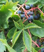 This woody deciduous vine grows thirty to fifty feet long and has palmate leaves with five leaflets that turn bright red to burgundy in fall while indigo berries appear on cerise stalks. It is native to woodland borders, clearings, meadows, and roadside from Quebec, Manitoba and Utah, south to Florida and Texas. USDA Hardiness Zones 3-9