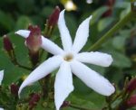Gold coast jasmine is an evergreen woody climber or rambling shrub native to tropical western and central Africa but was introduced in the 1920s as an ornamental into Florida in the 1920s where it has invaded hardwood forests, climbing trees and covering the native vegetation. It grows up to 26’ long with climbing stems longer, and has oval to roundish glossy, leathery leaves 2-4’ long and with pointed tips. Clusters of pink buds in leaf axils open to white, 1” long flowers that are star-shaped, fragrant, and open at night. USDA Hardiness Zone: 9-10