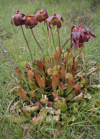 The Pitcher plant is a great favorite for bog gardens and is sure to pique the interest of every garden visitor. Insects are attracted to the funnel shaped leaves that grow in rosettes resembling a flower and to the nectar produced by the red veins. When the insects get to the curve in the funnel tube they are prevented from going back up by downward pointing hairs. They end up in the water, dew, and digestive enzyme mixture at the bottom of the tube where they are digested. This method of obtaining nutrients is not essential for their survival.