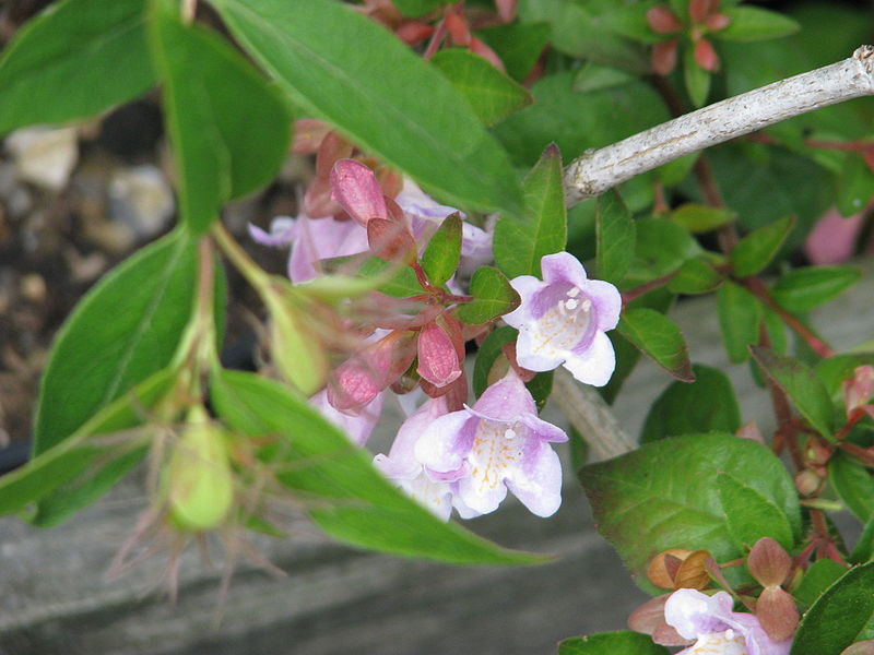 Native to the deep valleys of mountain forests in China, this evergreen to deciduous shrub is a member of the honeysuckle family, Caprifoliaceae, that also includes weigela, pincushion flower and teasel. It grows up to 7′ tall and has ovate to elliptic green leaves that emerge bronze on arching reddish shoots. The leaves are up to 1″ long, hairy, and often grey-green beneath. From summer to fall, funnel-shaped flowers appear singly or in clusters and are drooping or held horizontally. The flowers are fragrant, white to purple-lilac with orange specks on their bearded throats, and are surrounded by green sepals that turn red and persist into fall after the petals drop. Abelia schumanni can be used as a hedge or grown in containers and is a good addition to a fragrance garden. The genus name, Abelia, honors Dr. Clarke Abel (17801826), English naturalist and physician who was part of a British delegation to the emperor of China in 1816. The specific epithet, schumannii, honors Karl Schumann (1851-1904), a German botanist.