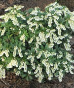 Early blooming evergreen shrubs are very special for year round interest in the garden and Pieris japonica is one of the best. Its large drooping clusters of small, waxy lily-of-the-valley-like flowers cover the bush in late winter or early spring when little else is blooming The color depends on the cultivar and can be white, pink, or red. Equally attractive is the new growth that can be bronze, pink or bright red, depending on the cultivar. Although most andromedas reach considerable size, they are slow growing and take years to fill their garden space. In addition, some smaller cultivars have been developed that are suitable for gardens with limited space. Andromeda is equally at home in a mixed border, woodland edge, or foundation planting especially when accompanied by other winter and spring blooming shrubs, tress and bulbs.