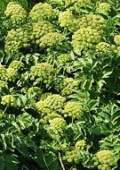 This native of Europe and Asia has a long history rich with folklore and myth but it is also a striking garden plant. Growing 5-8 feet all, it commands attention at the back of the border or as a specimen plant. The round hollow stem is divided into many branches that bear large globe-shaped clusters of tiny white or greenish fragrant flowers in mid summer. The leaves are divided and each oval leaflet is toothed. The plant is biennial or perennial depending on how you grow it. It dies after producing one crop of seed usually done in the second or third year. If you keep the plant from blooming it will last for several years.