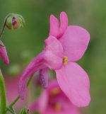This mat forming tender perennial is native South Africa. It is a member of the figwort family, Scrophylariaceae, that also includes butterfly bush, mullein, and nemesia. Plants grow 12″ tall and have glossy green, ovate-lanceolate leaves that are up to 1″ long and have toothed margins. The flowers appear from spring to summer in loose terminal racemes well above the foliage and are 3/4″ across, rose pink with a yellow throat, and have two 1/4″ long downward-angled spurs. Plants are usually grown as annuals but do not do well in high heat and humidity and may stop blooming as conditions become unfavorable for them. The least cold hardy of diascias, D. barberae is a good choice for West Coast gardeners or fall planting with pansies and snapdragons in other areas; good in borders, rock gardens, containers and hanging baskets. The genus name, Diascia, comes from the Greek di meaning two and askos meaning pouch, referring to the two sacs of the type species. The specific epithet, barberae, probably honors some plant enthusite with the surname of Barber, perhaps Mary Elizabeth Barber (1818–1899), and English naturalist.