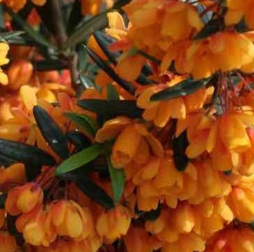 A native of Chile where it grows in woodlands 100-2000 feet above sea level, this vigorous evergreen shrub is upright and stiffly branched. The oval to lance shaped, shiny dark green leaves are leathery, 2½” long, and tipped with a spine. The rich orange flowers are borne in clusters of two to four in late spring and are ¾ inch wide. They give way to egg-shaped fruits, ½ inch long that ripen in the fall to a blue-black color. Plants make an excellent impenetrable hedge that needs only one pruning a year.
