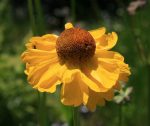 Native to moist mediows, streamsides, and marshes of California and Oregon this herbaceous perennial is a member of the aster family, Asteraceae, that also includes daisy, yarrow and lettuce. It grows 2-4.5′ tall and has mostly unbranched stems carrying glossy, lanceolate leaves that are decurrent and up to 10″ long, becoming smaller up the stem. From June to August the plants produce up to 20 solitary flowerheads that are 2-3″ wide and consist of dark yellow or brownish disc flowers surrounded by 14-20 yellow ray flowers. Each ray flower is wedge-shaped, three-toothed and reflexed. The flowerheads attract butterflies, bees and other pollinators. A good choice for a border as well as for meadow, wildflower, native plant, butterfly or rain gardens. The leaves, flowers, and seeds are poisonous to humans and livestock. The genus name, Helenium, honors Helen of Troy whose tears are said to have caused the plants to spring from the soil. The specific epithet, begelovii, honors J. M. Bigelow, a physician and plant collector who participated in the US Mexican Boundary Survey in the 1850s. The common name, sneezeweed, comes from the fact that the disc flowers and leaves were dried and used as snuff
