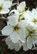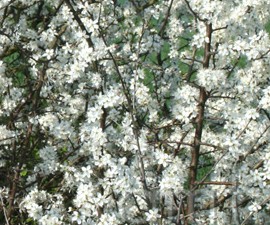 Blackthorn is a suckering deciduous shrub or small tree native to Europe, western Asian, and areas of northwest Africa where it grows in hedgerows, thickets, scrubland, and woodland edges. It is a member of the rose family (Rosaceae) and in the same genus as cherry, almond, and plum. The dense branches have dark bark and spines about three inches long. The oval leaves have serrated margins and are ¾ to 1 ¾ inches long by ½ to ¾ inches wide. The creamy white flowers with five petals appear slightly before the leaves in early spring and are about ½ inch across. They are followed in the fall by half inch wide blue black fruits enhanced with a whitish bloom that are called sloe and used to flavor alcoholic beverages. The plants are important to wildlife by providing food and cover for birds and insects. The genus name, Prunus, comes from the Greek word προύνη meaning plum, a prominent member of this genus. The specific epithet, spinosa, is from the Latin word spina, meaning thorn.