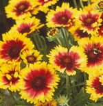 ‘Goblin’ (1′ tall, 4″ wide flowerheads with red ray flowers with yellow edges)