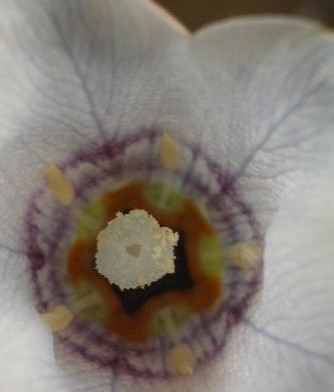 Bonnet bellflower is a herbaceous perennial climber in the bellflower family (Campanulaceae) and native to eastern and central Asia. It has brittle slender stems and pale gray-green leaves that are narrow, pointed, and foul smelling when touched. The pale ice- blue flowers appear in summer and are nodding and 1 long by ½ inch wide. Inside they have exquisite markings in golden yellow, blue, purple, and black. The fleshy tuberous roots resent being disturbed. Plants should be sited so that the delicacy and inside markings of the flowers can be appreciated but the leaves can not be touched. They grow best through shrubs.