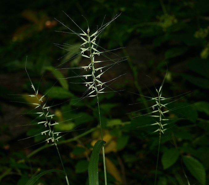 This cool season perennial grass is native to North America where it grows in woods and open clearings from Nova Scotia and Quebec to North Dakota and south to Virginia and Oklahoma. It is a member of the grass family, Poaceae, that also includes corn, rice, and bamboo. The plant forms tufts of linear, dark olive-green leaves that are 1/4-1/2′ wide and 4-8″ long. In mid summer, spikes of greenish, bristly, bottlebush-like flowerheads appear 1-2′ above the foliage. The flowerheads turn brown with maturity and shatter by early fall. Bottlebrush grass tolerates light shade and dry soil so is a good choice for woodland gardens and other partly shady settings. The flowers are attractive in fresh arrangements but must be cut as soon as they are fully open to avoid shattering. The genus name, Elymus, is from the ancient Greek word ἔλυμος (élumos) referring to millet. The specific epithet, hystrix, is from the ancient Greek word ὕστριξ (hústrix,) meaning porcupine, referring to the bristly appearance of the flowrheads.