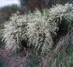 This deciduous flowering shrub is native to the Mediterranean region where it grows in coastal scrub often on sand dunes, and is a member of the pea family, Fabaceae, that also includes beans, lupines, and mimosa. Growing up to 10′ tall and 20′ wide, the bush has multiple slender gray-green weeping stems. The small leaves remain on the stems very briefly so the stems appears leafless most of the year. Short pendant racemes of white, pea-like flowers appear from mid winter to late spring, and are sweetly fragrant and attractive to bees and butterflies. Fruits are one seeded pods and seed production is prodigious. Plants are grown for use in medicine and in soil stabilization projects as well as ornamentals in areas with hot, dry summers and cool, moist winters. They are tolerant of drought and salt-laden winds, and can be used in seaside gardens. The flowers are good for preserving and drying. The genus name, Retama, is the Latinized form of the Arabic name for the plant, retem. The specific epithet, monosperma, is derived from the Greek words monos meaning one and spermus meaning seed, and refers to the one seeded fruit of the plant.