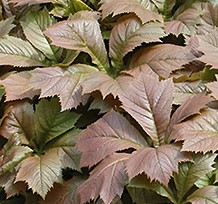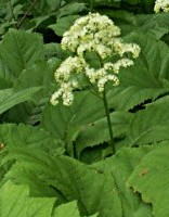 Rodgersia podophylla is a clump forming rhizomateous perennial native to Japan and Korea where it lives in moist soil along streams and in shaded woodlands. It is a bold plant and adds an architectural statement to a garden bed. The large deeply veined leaves are proabably its most prominant features and gardeners find them irresistable. They are one foot wide, bronze green in the spring, green in the summer, and red bronze in the fall. Each leaf is palmately compound with five to seven leaflets. The leaflets are shaped like duck’s feet with jagged edges and three to five lobes at the tip. The small creamy white flowers lack petals and are carried in panciles over one foot long well above the foliage in mid-summer. R. podophylla is an excellent choice for a bog garden or other wet sites but must be protected from the wind because of the large size of its leaves. The specific name, podophylla, comes from the Greek podos meaning foot, and phyllon maning leaf.