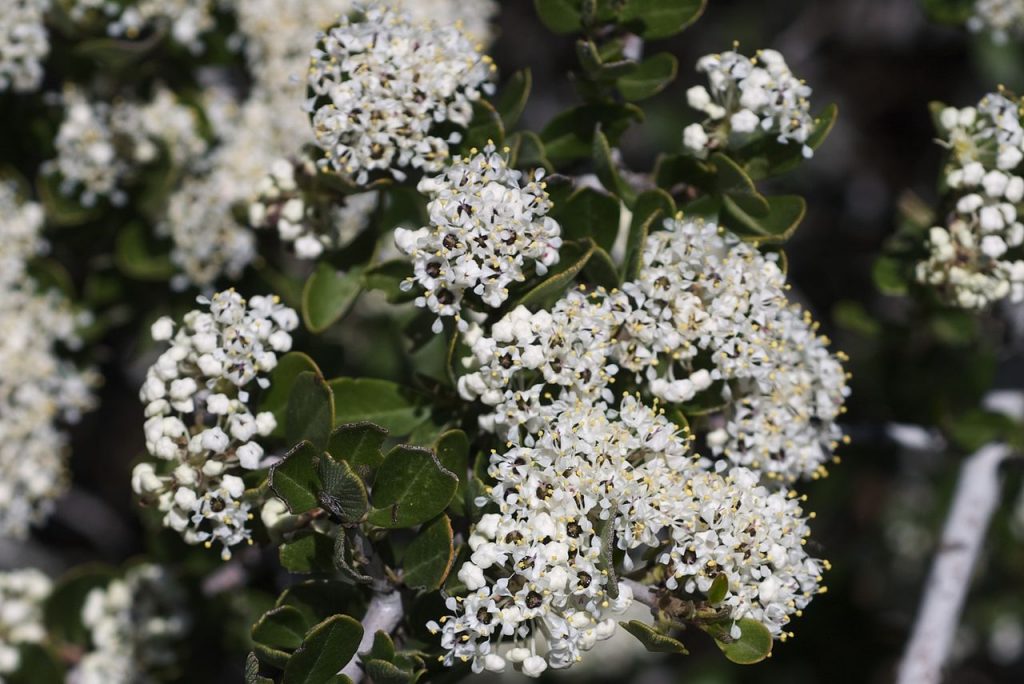 Also known as wedgeleaf ceanothus, this evergreen shrub is native to Oregon, California, and northern Baja California, where it grows in several habitats, especially chaparral. It is a member of the buckthorn family, Rhamnaceae, that also includes California lilac, jujube tree, and crown of thorns. The plant grows up to 12′ tall and has thorny, rigid branches that grow at right angles to the main stem. The small spoon-shaped, fleshy leaves are tough and stiff, and may have toothed margins. In early to mid summer, short, thick-stalked racemes of rounded bunches of tiny fragrant flowers appear. Each flower is about .2″ wide creamy white, sometimes tinted with blue or lavender, and is attractive to bees and butterflies. The fruit is a round capsule with horns and contains 3 shiny dark seeds that are forcibly expelled when the capsule opens. Fire is needed for germination and the seeds may lie dormant in the soil for a long time. Buckbrush is valued for bank stabilization, as a larval host for several butterflies, and as cover for wildlife. The genus name, Ceanothus, is from the ancient Greek κεάνωθος (keanōthos), the name of a thistle. The specific epithet, cuneatus, is the Latin word meaning wedge-shaped, and refers to the leaf shape.
