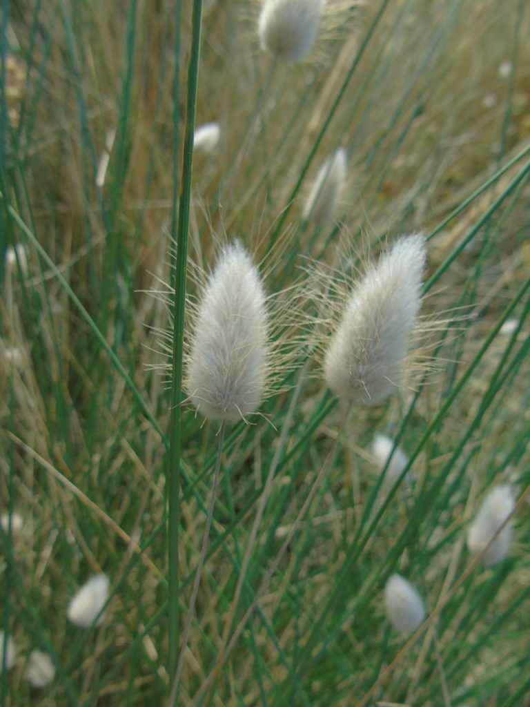 Also known as Turk’s head grass and hare’s tail grass, this fine textured grass is a native of Mediterranean shores and a member of the grass family, Poaceae, that also includes corn, rice, and bamboo. Although perennial in warm climates it is usually grown as an annual in USDA Hardiness Zones 7 and cooler. The plant grows 1-2′ tall and form a clump of soft, linear, gray-green leaves up to 8″ long. In summer, slender stems bear dense, oval, furry looking panicles that resemble rabbit’s tails. The panicles are up to 3″ long and are at first greenish but mature to cream and then tan. The flowerheads do not shatter as those of other grasses do and so are especially valued for fresh and dry arrangements. The plants do well in beds, borders, containers and informal sites such as cottage and prairie gardens. The genus name, Lagurus, is from the Greek lagos meaning a hare, and oura meaning a trail, referring to the shape of its flowerheads. The specific epithet, ovatus, is from the Latin word ovare meaning to lay eggs, and refers to the seed heads.