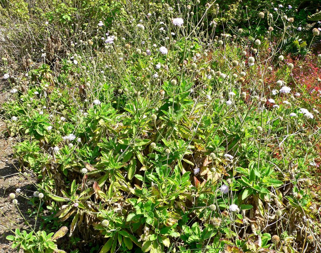 A rare plant suitable only for West Coast gardens, this evergreen herbaceous perennial is native to the fynbos of South Africa and a member of the honeysuckle family, Caprifoliaceae, that also includes weigelia, Centranthus, and valerian. The plant forms a rosette of woolly, obovate to oblong basal leaves that are up to 8″ long, and have ruffled, coarsely toothed margins. From early spring into early summer, erect, woody, branched stems up to 4′ tall carry lavender blue to white flowerheads that are 2″ across and are attractive to butterflies, bees and other pollinators. The plants self seed but become untidy as they mature and are most suitable for informal gardens. The flowers are excellent in the vase. The genus name, Scabiosa, comes from the Latin word scabies meaning itch and refers to the leaves that were thought to cure scurvy. The specific epithet, africana, refers to the area where the plant is native.