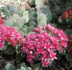 Also called shortleaf stonecrop, this succulent perennial is native to Japan where it grows on rocky cliffs. It is a member of the stonecrop family, Crassulaceae, that also includes jade plant, hens and chickens, and kalanchoe. The plant has trailing stems that grow up to 8″ long and up to 3″ tall from a central crown. The pink-tinged silvery grey-green leaves are round and 1/2″ long. From late summer to early fall, 6″ long stems bear purplish pink star-shaped flowers. Cliff stonecrop is a good choice for containers, rock gardens and alpine gardens, and is especially attractive spilling over the cracks in pavement. The genus name, Sedum, comes from the Latin word sedeo meaning sit, and refers to the low growing habit of the plant. The specific epithet, cauticola, comes from the Latin word, cautes, meaning rock or cliff and the suffix -cola meaning dweller, referring to the native habitat of the plant.