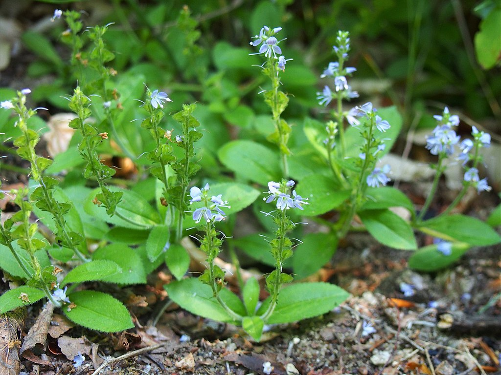 Also known as heath speedwell, common gypsyweed, and Paul’s betony, this mat-forming herbaceous perennial is native to open areas in Europe and western Asia. It is a member of the plantain family, Plantaginaceae, that also includes foxglove, snapdragon, and angelonia. Plants grow 4-12″ tall and have hairy, branched, mostly prostate stems. The opposite, softly hairy leaves are 1/2-2″ long, oval-elliptic to egg-shaped, and have toothed margins. In summer, short racemes of flowers appear over a long bloom period. The flowers are 1/4 to 1/3″ across and have four rounded lobes that are pale blue, violet or pinkish-purple streaked with darker purplish lines. Stems root at the nodes and plants can become weedy. The genus name, Veronica, honors St. Veronica who gave her veil to Christ as he walked to Calvary. The specific epithet, officinalis, is the Latin word meaning belonging to an officina , the storeroom of a monastery where medicines and other necessaries were kept, and refers to the medicinal use of the plant.
