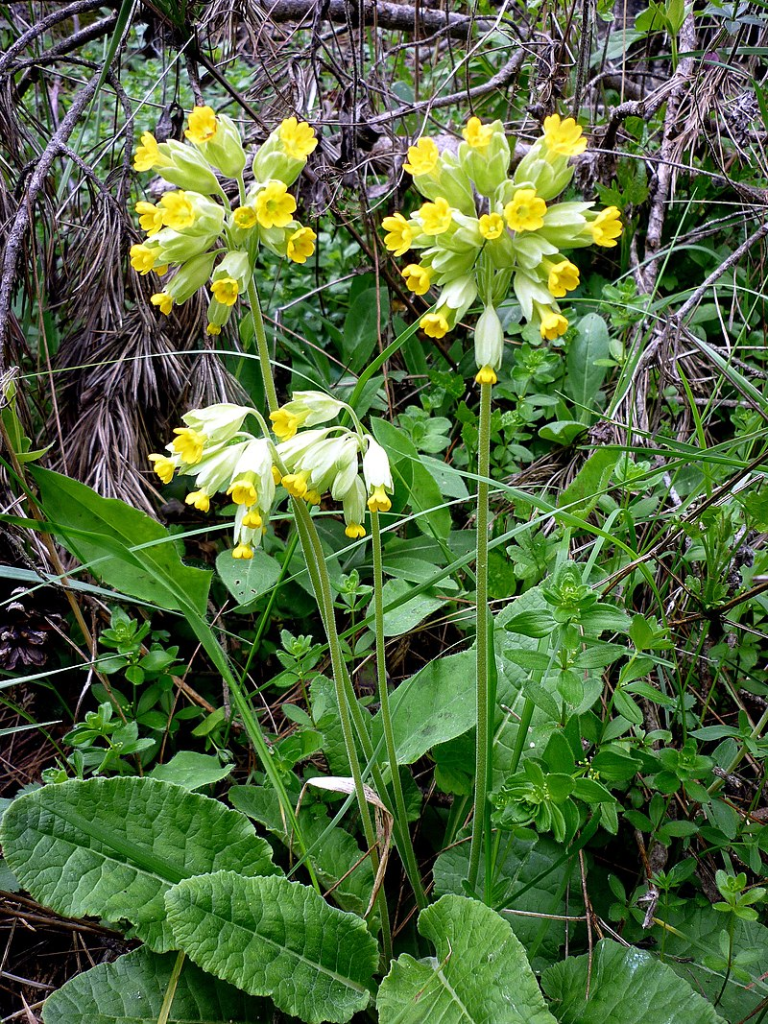 Native to temperate Europe and western Asia, this evergreen or semi evergreen herbaceous perennial is a member of the primrose family, Primulaceae, that also includes scarlet pimpernel. Plants form a 4″ tall basal rosette of oval to lance-shaped leaves. The leave are 3-6″ long, crinkled and have irregularly-toothed margins and soft-hairy undersides. Clusters of 1-30 nodding, yellow flowers appear on upright stems 6-8″ tall from mid to late spring. The flowers are funnel shaped, .5-.75″ long, and may be single or double. They have red spots on their petals and a fresh fragrance that attracts butterflies. Plants go dormant in hot weather. The genus name, Primula, is the diminutive form of the Latin word, primus, meaning first. The specific epithet, veris, is the Latin word meaning of spring so the whole botanical name, Primula veris, means little early one of spring referring to its diminutive size and bloom time.