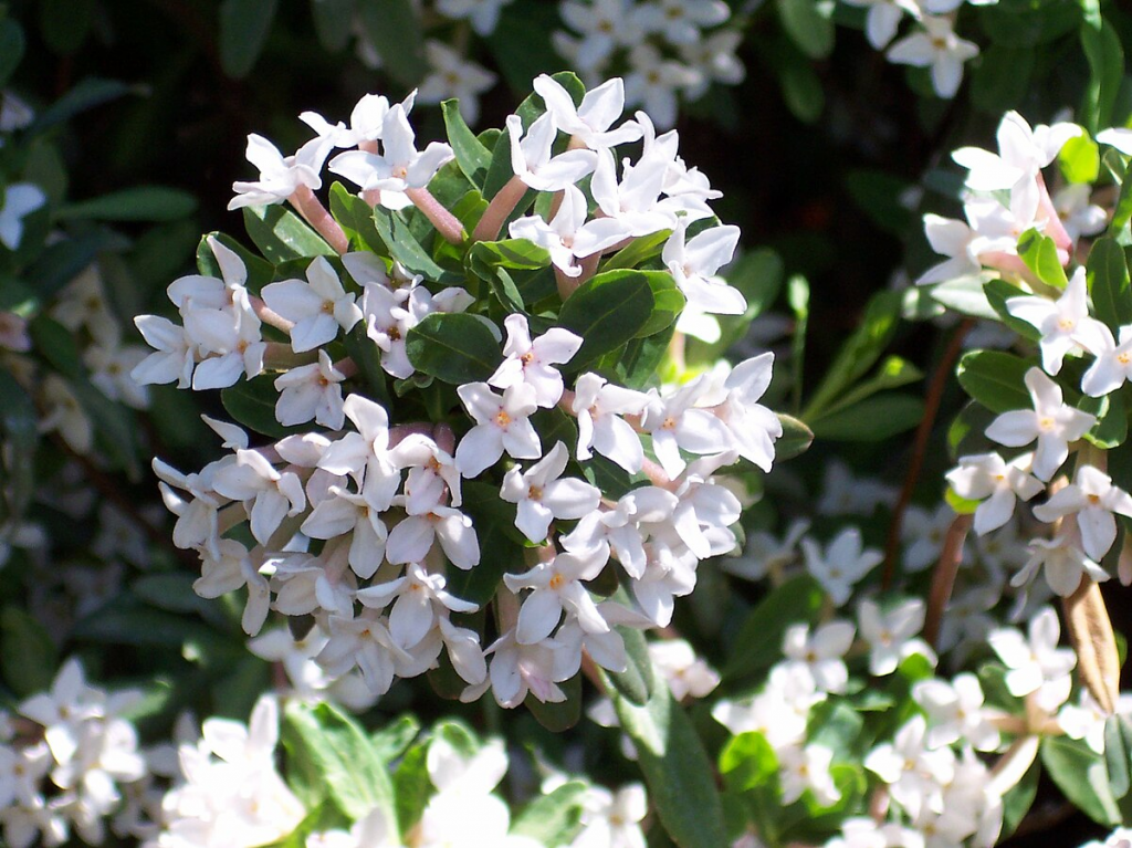 This semi evergreen to deciduous shrub is the result of a cross between D. caucasica and D. cneorum and is a member of the Thymelaeaceae, a plant family of just under 900 species, most of which are unfamiliar to North American gardeners. The plant grows 3-4′ tall and wide, and has a dense, rounded habit. The leaves are 1-2″ long, lanceolate to oblanceolate, and dull blue-green. In late spring, 1-2″ wide umbels of pink-tinged buds open to pale pink to white flowers with a possible rebloom in late summer or early fall. The flowers are tubular, .5″ across, and very fragrant. The red berries that follow are attractive but poisonous to mammals. Several desirable cultivars are available but plants are difficult to transplant so should be left in place once planted. D. x burkwoodii is a good choice for use as specimen, in borders and foundation plantings as well as in woodland and fragrance gardens. The genus name, Daphne, honor a nymph of Greek mythology associated with fountains, wells, springs, streams, brooks and other bodies of freshwater. The hybrid name, burkwoodii, honors the plant breeder Albert Burkwood (1888-1951).
