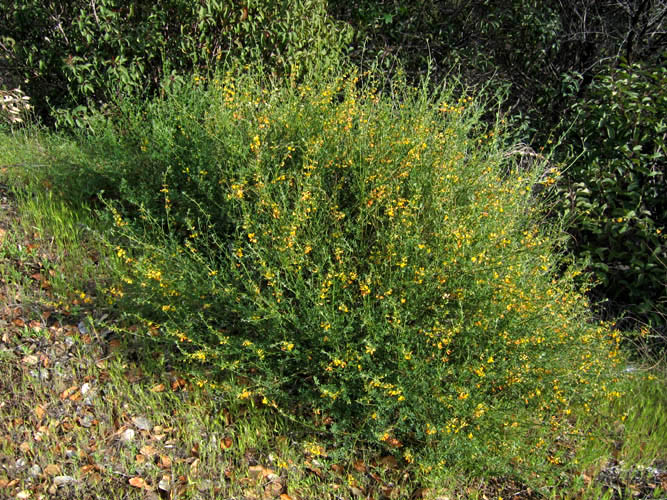 Also called deervetch, California broom, and western bird’s-foil, this deciduous perennial subshrub is native to California and is a member of the pea family, Fabaceae, that also includes lupine, mimosa, and black locust. The plant grows up to 3′ tall and has flexible green branches bearing pinnately compound leaves with 3-5 oblong leaflets sparsely covered with short hairs. From early spring to late summer, small, yellow flowers appear in cluster of 2-7 in the upper leaf axils. The flowers mature to red and are attractive to hummingbirds, butterflies, and other pollinators. The fruit is a curved pods with two seeds. Although not especially ornamental, the plant is valued for use for soil erosion control, habitat restoration, and food for wildlife including deer. The genus name, Acmispon, is of uncertain origin. The specific epithet, glaber, is the Latin word meaning hairless.