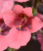 This sprawling, semi-evergreen perennial is native to South Africa and is a member of the figwort family, Scrophylariaceae, that also includes butterfly bush, mullein, and nemesia. It grows up 10- 12″ tall from a stoloniferous root system and has glandular tipped hairs covering its slim wiry stems and heart-shaped, mid-green, 1″ long leaves. From late spring to fall loose terminal racemes carry salmon-pink, cup-shaped flowers that have 5 lobes and bear a ‘moustache’ of dark glands in a straight line on the lower lobe under the stamens. Plants are very floriferous and a good choice for borders, cottage garden, and containers. The genus name, Diascia, comes from the Greek di meaning two and askos meaning pouch, referring to the two sacs of the type species.