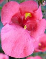 This clump-forming, stoloniferous, evergreen perennial is native to South Africa where it grows in mountainous areas along streamsides, on cliffs, and in rock crevices and gravely areas. It is a member of the figwort family, Scrophylariaceae, that also includes mullein, butterfly bush, and nemesia. Plants grow 12-18″ tall and have numerous soft blue-green wiry stems that sometimes become woody at the base and tend to be low growing with ascending tips. The blue-green narrow leaves are ovate, 1-3″ long and mostly clustered at the bottom of the stems. From spring to frost bright rose-pink flowers appear in terminal racemes that open from bottom to top. Each flower is 3/4″ across and has four small curly petals above a larger drooping lip, and two spurs containing oil that attracts bees. At the center of the flowers are dark yellow and maroon markings. D. integerrima is considered the most widespread, toughest, and floriferous of all the Diascia species. Although at least one form of D. integerrima, ‘Coral Canyon’, is hardy to USDA Zone 5, plants produce the best flower display if grown as annuals. It is a good choice for borders, rock and cottage gardens, and containers especially baskets where its trailing nature can best be appreciated. The genus name, Diascia, comes from the Greek di meaning two and askos meaning pouch, referring to the two sacs of the type species. The specific epithet, integerrima, is the superlative form of the Latin adjective integer, and means very entire, referring to the leaf margins.