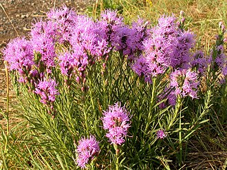 Also known as dotted blazingstar and narrow-leaves blazingstar, this herbaceous perennial is native to the central plains of the US from Canada to northern Mexico. It is a member of the aster family, Asteraceae, that also includes daisy, yarrow, and lettuce. Plants grow from a tap root up to 16′ long and produce one or more erect unbranched stems 12-24″ tall. The stems carry densely packed, narrow, grass-like leaves that have short white hairs on the margins and are covered with dots of resin. The leaves are up to 4′ long at the base of the plant, getting smaller as they ascend. In summer, 6-20″ long terminal spikes of pink, purple or white flowerheads appear on each stem. Each flowerhead consists of 3-8 star-shaped disc flowers 3/4″ long and is surrounded by a involucre of green to purplish bracts . Unlike most spikes, the flowers open from top to bottom. Dotted gayfeather is long lived and with its deep tap root up to 16′ long is very drought resistant. In addition, it is fire tolerant and can resprout from its rhizomes. Plants are attractive in mixed border and the flowering stems are good in both fresh and dried arrangements. A good choice for a xeriscape as well as meadow, native plant, wildflower, and cutting gardens. The genus name, Liatris, is of unknown origin. The specific epithet, punctata, comes from the Latin word punctus, meaning little hole or point and refers to the dots of resin on the leaves.