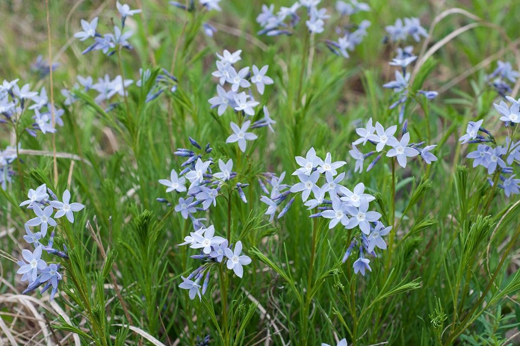 A native of southeastern United States, this herbaceous perennial is a member of the dogbane family, Apocynaceae, that also includes perwinkle, oleander, and milkweed. The plant grows 1-3′ tall and has linear dark green leaves that are 2-4″ long, hairy and have margins that curl slightly toward the underside of the blade. The foliage clusters towards the ends of the stems, looks attractive all summer and turns golden yellow in the fall. In spring, terminal racemes of starry, pale blue, 1/2″ flowers appear and persist for 3-4 weeks, attracting butterflies and other pollinators. Downy bluestar forms dense clumps, provides long season interest from spring to fall , and may be used as a hedge or low screen. The genus name, Amsonia, honors John Amson (1738–circa 1764) physician and amateur botanist in colonial Williamsburg. The specific epithet, ciliata, is the Latin word for the edge of the upper eyelid i.e. the eyelashes, and refers to the hairs on the leaves.