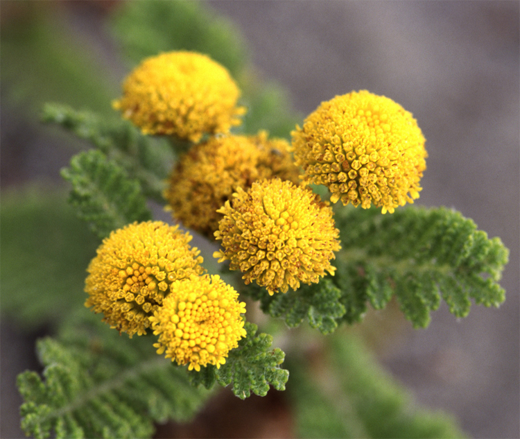 Also known as camphor tansy, this herbaceous perennial is native to the Pacific Coast of North America from British Columbia to Northern California where it grows on sand dunes and in other coastal habitats. It is a member of the aster family, Asteraceae, that also includes sunflower, goldenrod and lettuce. The plant grows 4-24′ tall and forms colonies with thick branching stems and a rhizomatous root system. The thick, fern-like, gray-green leaves are up to 10″ long and twice or thrice divided into leaflets with edges curled under and covered with glands. From summer into fall, clusters of 3-15 flowerheads appear. Each flowerhead is button-shaped, .4-1″ across, and composed of many yellow disc florets surrounded by many pistillate florets and sometimes a few tiny ray florets. The fruit is an tiny achene tipped with a small pappus. The plant is hairy and aromatic with a camphor-like scent. Considered a rare plant, dune tansy is an attractive groundcover and useful for erosion control but can be aggressive. The genus name, Tanacetum, is from the Greek prefix a- meaning not, thanatos meaning death probably referring to the plant’s persistence. The specific epithet, camphoratum, is from the Medieval Latin word camfora, the name given to the whitish, volitile substance with a penetrating odor, and refers to the scent of the plant.