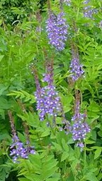 This herbaceous perennial is a member of the legume family (Fabaceae) and native to the meadows and open forests of the Caucasus but is grown elsewhere as a fodder crop. The tall stems branch at the middle and carry pinnately compound leaves withovalleaflets. The violet blue pea-like flowers are carried on spikes of 25-70 from mid to late summer and give way to seed pods containing eight small seeds. It has a taproot and rhizomes and can spread quickly is favorable sites. Like many other legumes it fixes nitrogen in the soil. Although tolerant of diverse conditions it does not tolerate acidic or waterlogged soil.