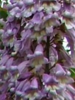 Bloom: Large clusters of vanilla-scented, violet-blue flowers in spring; clusters are six to ten inches long; foxglove-like flowers are 1.5 to 2 inches long, and have creamy yellow stripes and dark purple spots in the inside.