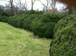 English boxwood is an evergreen shrub native to western and southern Europe, northwest Africa and southwest Asia where they grow in open woodlands and rocky hillsides. It and is member of the Buxaceae family that consists of 123 species in 6 genera. Plants grow only 1″/year eventually reaching up to 4-5′ tall but can be kept at 6-12″ by a yearly pruning. The oval to oblong leaves are up to 1/2″ long and have smooth margins. They are glossy apple green in the spring and mature by fall to dark green. In early spring the inconspicuous flowers appear in axillary clusters and are creamy white to green or yellow. Boxwood makes a magnificent hedge in a formal garden where they can provide strong structure that looks attractive all year long. As a bonus they are fabulous Christmas greens and can be made into table top trees, kissing balls, and wreaths as well as used in mixed greens arrangements. They have a long vase life so can be used early in the season and will still look great a month later. Even if used without a water source they will dry well and be an attractive addition to your holiday décor. The genus name, Buxus, is the Latin name for the plant. The specific epithet, sempervirens, comes from the Latin words semper meaning always and virens meaning green and refers to their year around green foliage. The cultivar name ‘Suffruticosa’ comes from the Latin words sub meaning under and fruticosus meaning full of leaves, and refers to the high density of the leaves.