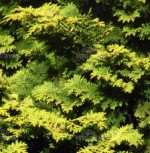This dense pyramidal conifer with feathery branchlets tipped with gold is not a cypress at all and is better called a false-cypress. Like other false cypress it prefers humid areas so is a treasure for those living in the mid- to upper Southeast. It is especially attractive in the winter garden where its gold color brings a sunny glow to an otherwise gray landscape. A slow-growing dwarf, it needs a couple of decades to reach 8-10 feet but may eventually reach 30 feet. It rarely needs pruning.