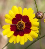 Known by several names including golden coreopsis, plains coreopsis, and calliopsis, this annual is native to much of the US especially the Great Plains and South where it grows in dry fields, roadsides, waste places, and pastures. It is a member of the aster family, Asteraceae, that also includes daisy, yarrow, and lettuce. Growing up to 4′ tall from a fibrous root system, the plant has a 4-sided wiry stem that branches about 2/3 of the way up and carries medium green leaves on short petioles. The leaves are up to 6″ long and may be simple or double-pinnate with linear to lanceolate leaflets or lobes up to 2″ long. From mid summer into fall single flowerheads appear that are 1-2″ across and consist a dark red center of disc florets surrounded by 6-12 ray florets that are are reddish brown at the base and golden yellow at the notched tips. Cultivars are available that offer variety in plant height, and color and number of ray florets. Plants tend to self-seed. Flowering stems are excellent in the vase. Golden tickseed is a very good choice for naturalizing and use in borders, cottage, meadow, wildflower, native plant, herb, and cutting gardens. The genus name, Coreopsis, comes from the Greek words koris meaning bug and opsis meaning like/similar to and refers to the appearance of the seed. The specific epithet, tinctoria, comes from the Latin word tinctorius, meaning used in dyeing, and refers to the use of the flowers to make a mahogany red dye.