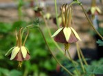 Green columbine is a mound-forming herbaceous perennial native to China, Japan, Mongolia, and Siberia where it grows in forests, grassy slopes, valleys and wet places. It is a member of the buttercup family, Ranunculaceae, that also includes delphinium, anemone, and monkshood. The blue-green leaves are biternate and lobed; the fragrant flowers are ¾” long, nodding to semi-erect, and have light green sepals and yellow green to brownish purple petals with short straight or slightly curved spurs. They appear in loose clusters of three to seven from late spring to early summer. The mounding habit makes the plant a good choice for a rock garden and its preference for shade makes it useful for woodland gardens. Self-seeds. The genus name, Aquilegia, may come from the Latin word aquila meaning eagle and refers to the spurs that resemble an eagle’s talons. The specific epithet, viridiflora, comes from the Latin words viridis meaning green, and florus meaning flowered.
